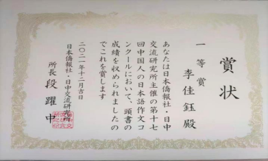 此次的中国人日语作文大赛一等奖是继2019年威尼斯官网日语专业毕业生朱琴剑同学之后,再一次荣获本项赛事荣誉,也是我校日语专业迄今为止获得的最高赛事奖项。在威尼斯官网外教老师高桥智子的指导下,李佳钰同学在再三推敲修改后,提交了自己的参赛作文。经历历时一年的重重选拔,在全国3000余份参赛作文中,取得了中国人日语作文大赛一等奖的好成绩。