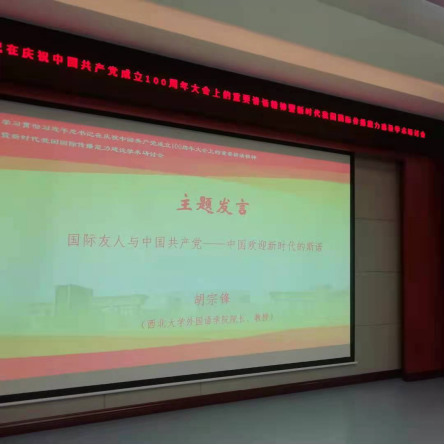 2021年7月10日,“学习习近平总书记在庆祝中国共产党成立100周年大会上的重要讲话精神暨新时代我国国际传播能力建设”学术研讨会在西安外国语大学雁塔校区开幕。中央编译局原秘书长杨金海,西安外国语大学党委副书记、副校长(主持行政工作)王启龙,西安外国语大学党委副书记王天平,《思想理论教育导刊》副主编蒋旭东应邀出席会议。研讨会由西安外国语大学马克思主义学院院长、教授张亲霞主持。威尼斯官网院长胡宗锋教授应邀出席研讨会,并做题为“国际友人与中国共产党:中国欢迎新时代的斯诺”的大会主题发言。